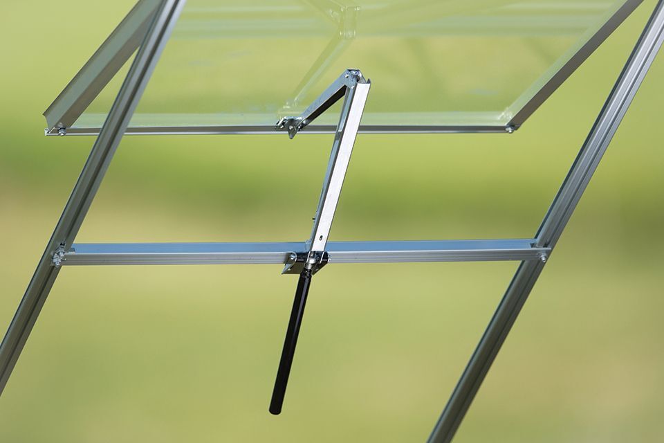 Het luchten van de kas is van levensbelang. Deze automatische zwarte raamopener zorgt daarvoor, ook als ik er niet ben. Door reactie op de temperatuur in de kas wordt het raam automatisch geopend en sluit het wanneer nodig.